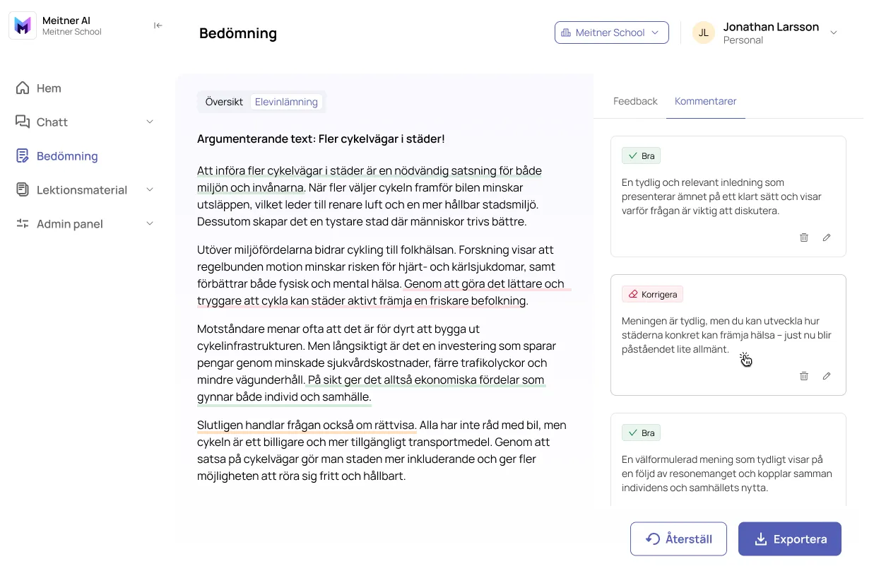 Som lärare får du då en översikt över elevens text och en separat feedbackvy där du kan få ett färdigt utkast med feedback och kommentarer.