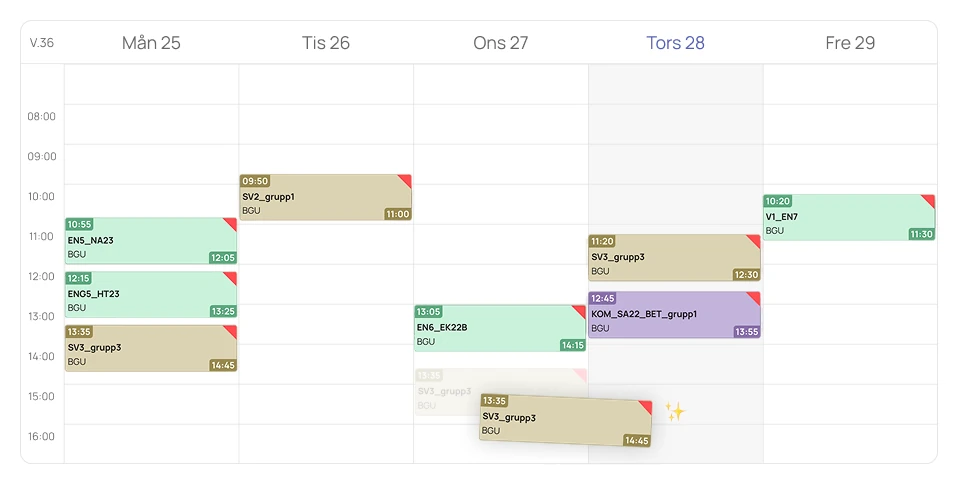 Meitner Schedule places lessons automatically and avoids conflicts. The system takes break-requirements into account and assigns rooms based on needs such as sports, theory, and science labs.