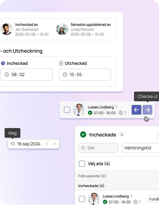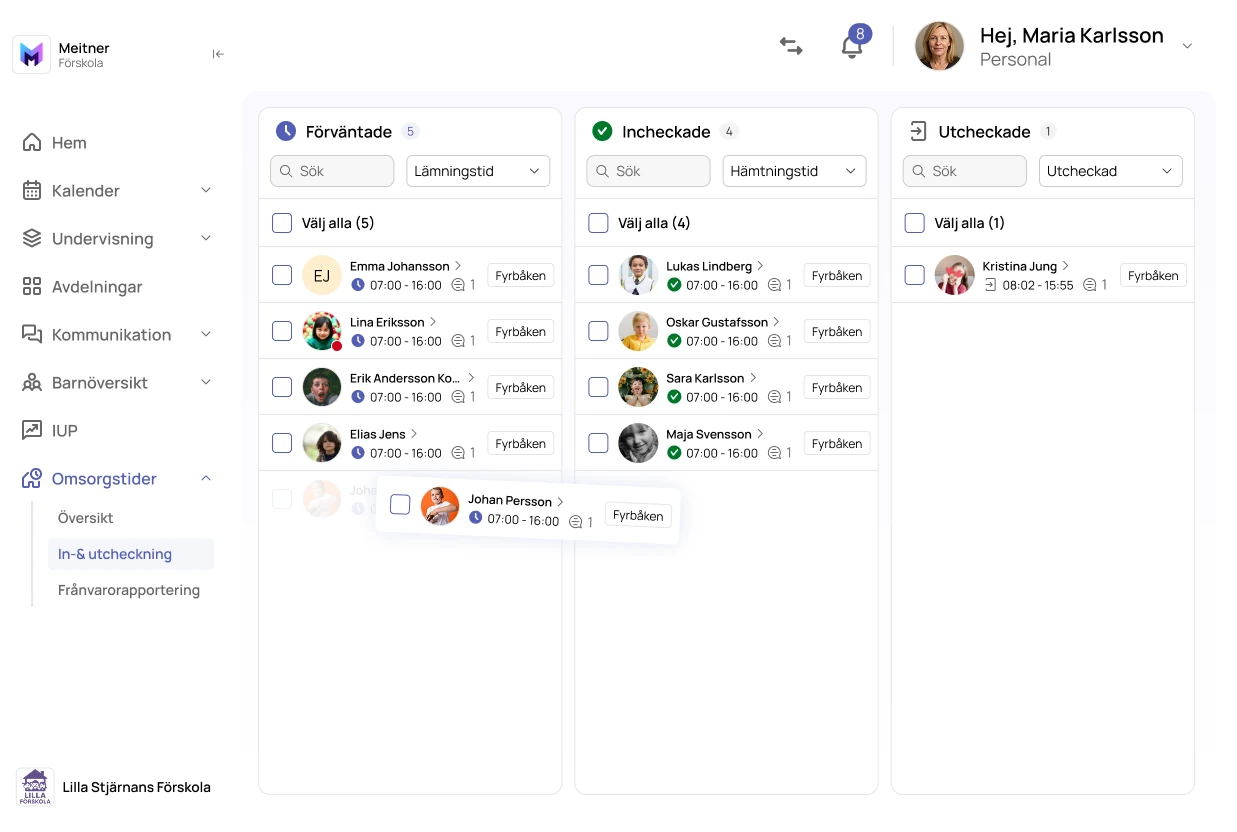 Vårdnadshavare kan utifrån verksamhetens öppettider och barnets rätt till omsorg enkelt ange sitt barns vistelsetider direkt i Meitner. Dessa tider skapar sedan ett underlag i vilket man ser antalet barn per dag. Detta blir ett stöd för planering av verksamheten. Meitner har stöd för att hantera olika omsorgsregler för lov och andra schema avvikande aktiviteter. Vårdnadshavarna får påminelser så att de inte glömmer att ange tiderna. Ett smidigt stöd för in- och utcheckning skapar både trygghet och tydliga rapporter och faktiska tider.