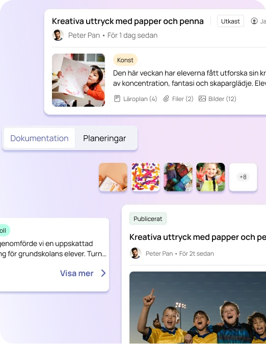 Pedagogen kan i olika avdelningar skapa planeringar och koppla till förskolans läroplan. Detta kan enkelt följas upp för att se vilka områden som berörts över tid. Med ett smidigt verktyg kan förskolepedagogen enkelt dokumentera olika moment som genomförs med taggar och bilder. Detta kan kopplas till läroplanen. Även individuella barn kan taggas för koppling till barnets portfolio. Allt för att förenkla det dagliga arbetet.