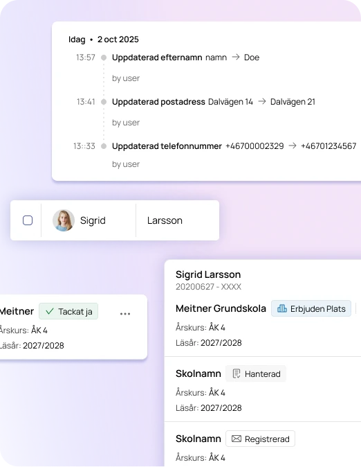 Meitner har en modul för ansökan och köhantering till privata förskolor, som enkelt kan aktiveras. Här får vårdnadshavare möjlighet att ställa sitt barn i kö, från den ålder som förskolan ställer in i adminpanelen. Ansökan tar med önskat startdatum, kontakt-och personuppgifter, samt syskonförtur. Förskolans administration kan sedan enkelt få en samlad bild av alla som står i kön till förskolan och anta barnen i tur och ordning. Information om möjlig plats skickas ut till vårdnadshavare som då kan godkännas genom BankID direkt i Meitner.